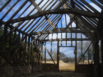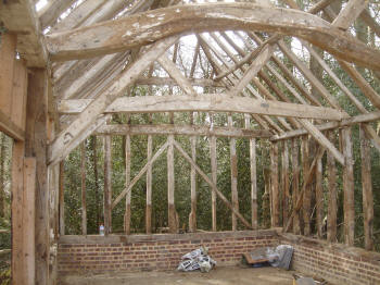 Four-bay queen strut side purlin roof with much character.